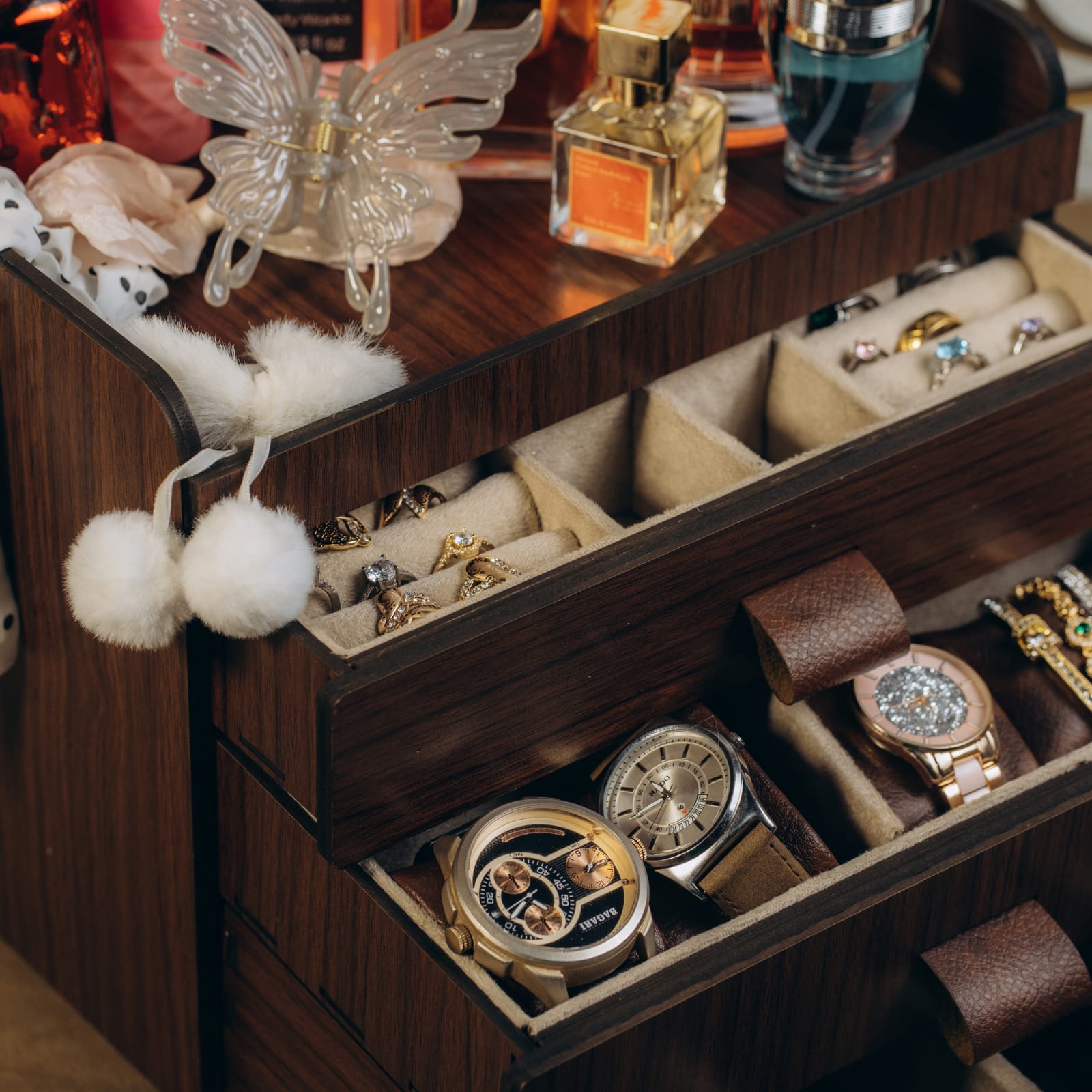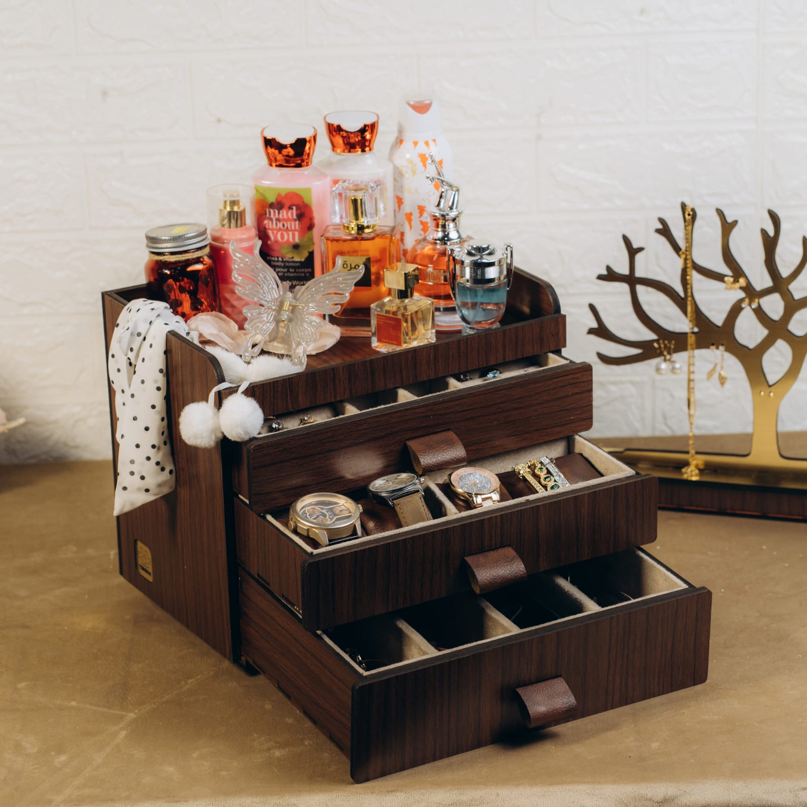 الدرج يحتوي على مكان مخصص للخواتم و 3خانات تصلح لاستخدامات متعددة + عدد 2 اوبليت فيبر