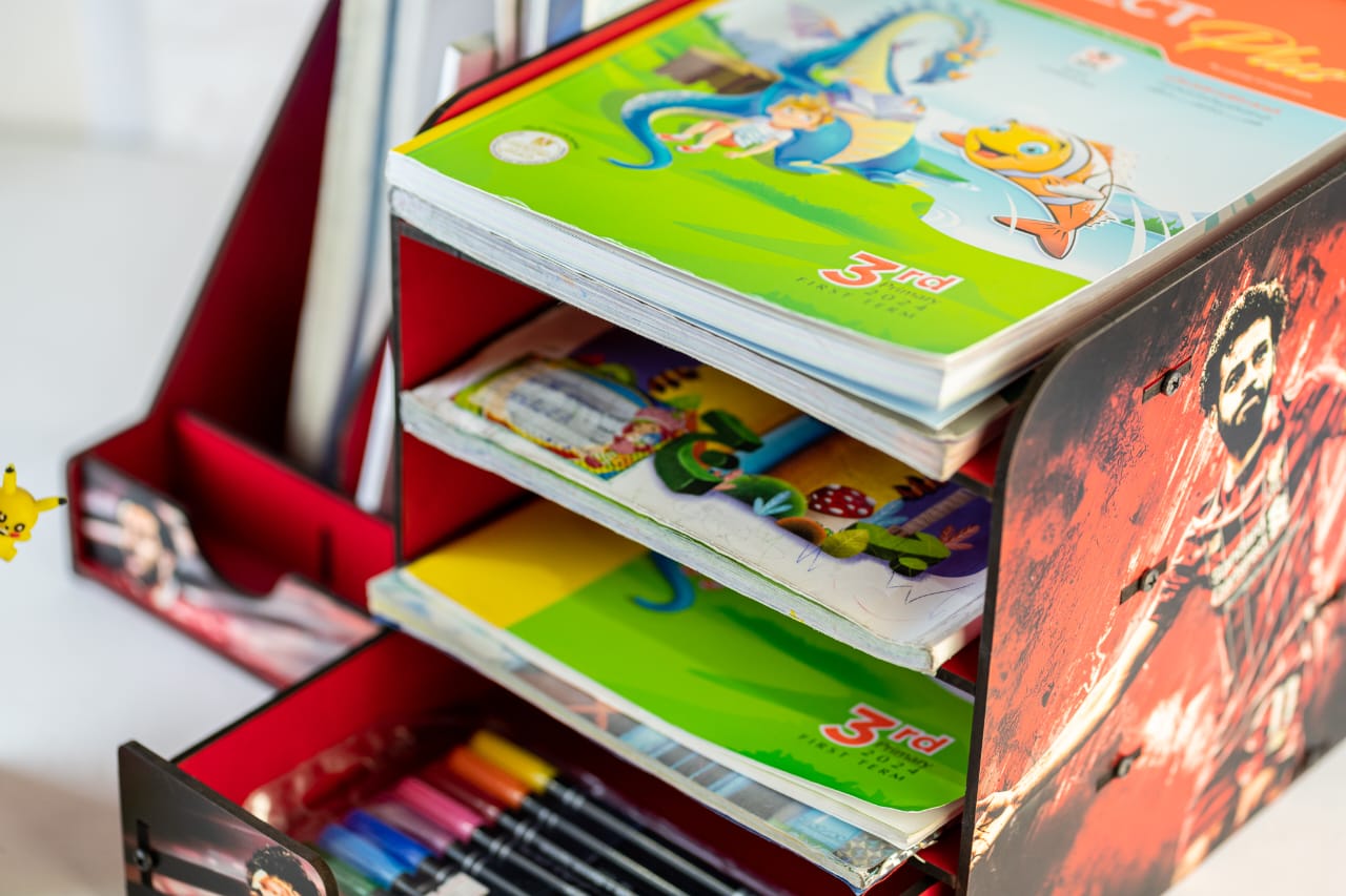 منظم مكتبي دراسي مطبوع للأطفال . تصميم مطبوع بشخصيات كرتونية وألوان مبهجة