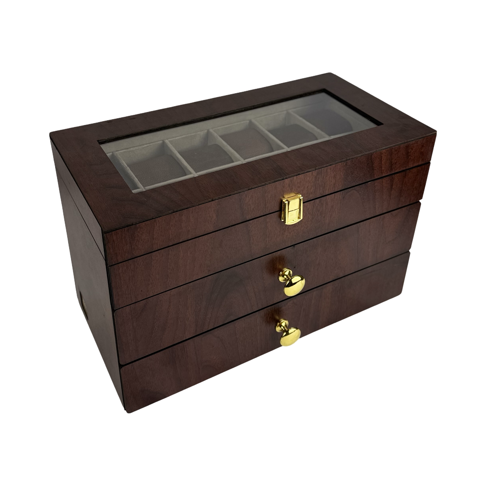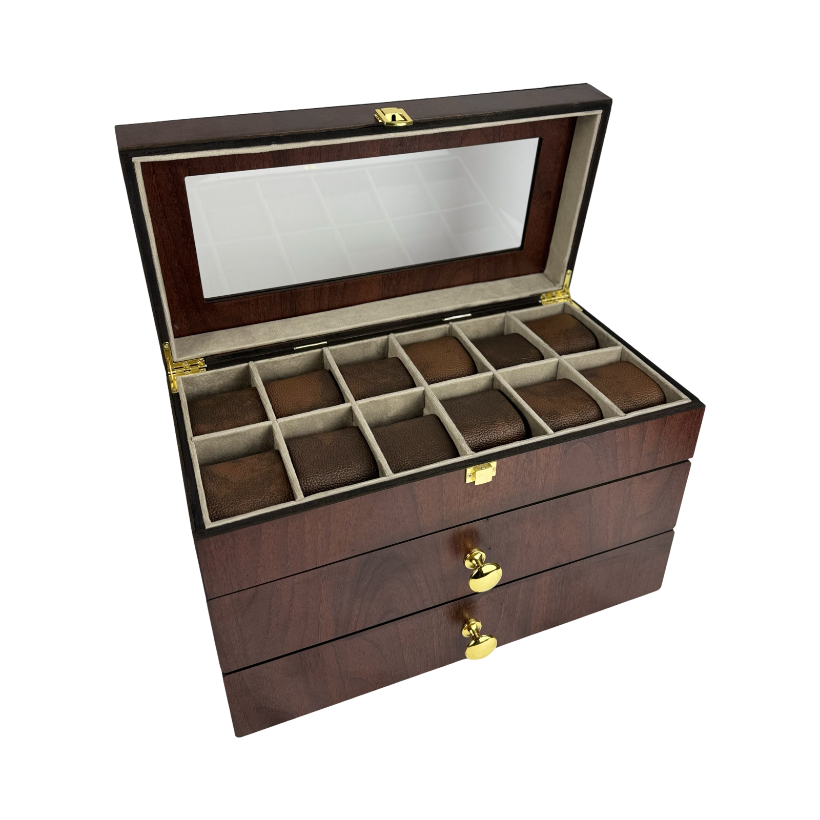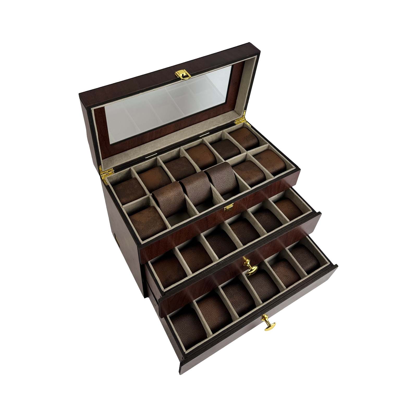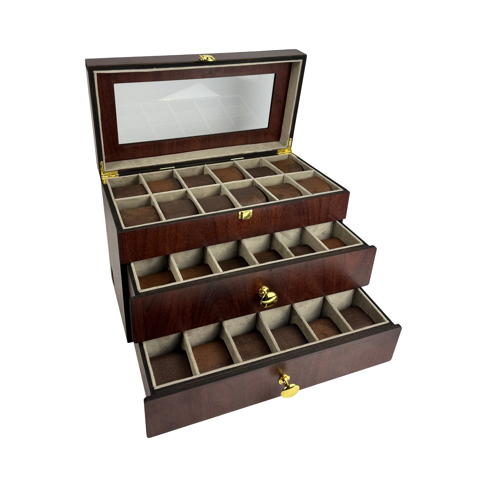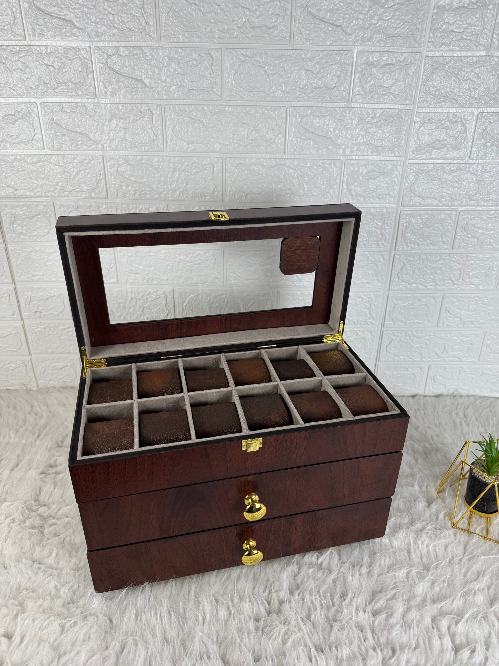 حافظ علي نظاراتك.ساعاتك وخواتمك منظمة بأناقة مع هذا المنظم العملي والفاخر يأتي ب40 خانة قابلة للتخصيص حيث يمكنك إعادة ترتيب التقسيمات لتناسب احتياجاتك - سواء كنت تود استخدامه بالكامل للساعات أو تقسيمة بين الساعات والنظارات والخواتم والإكسسوارات الأخري